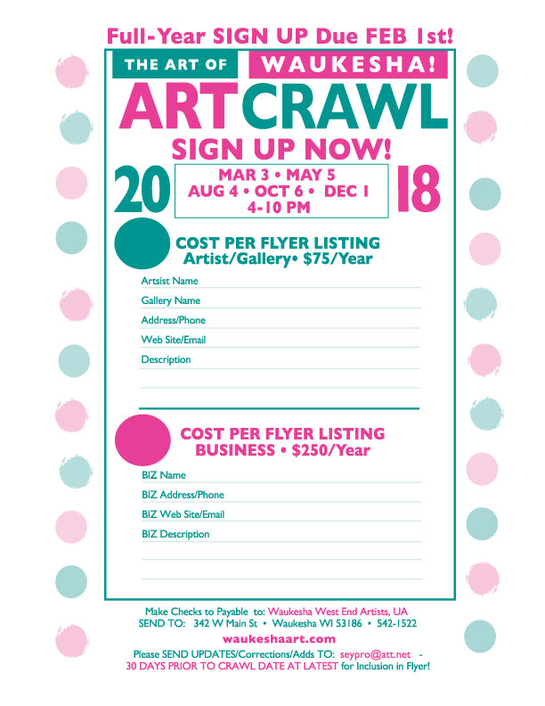 November 11, 2017. Calling all Waukesha Artists * Galleries * Businesses! If you are interested in signing up to appear in our 2018 Art Crawl Flyers (as well as this website), here is the 2018 sign up form! Full-year sign up is Due on Feb. 1st., 2018. Please let us know if you have any questions. Thank You!