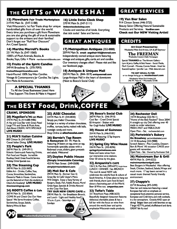 November 18th, 2017. Greetings Waukesha Art Enthusiasts! We wanted to invite you all to our #99 Happy Holiday Art Crawl on Saturday, December 2nd 2017! 4pm – 10pm. Explore our Amazing Galleries, 175 Artists, Live Music, Holiday Shopping, Great Drinks/Eats & Treats, and More! Thank you to our Crawl Sponsor: Magellan’s & M2 – Thanks Pizza Man Dan! Below is our #99 flyer of all the participating businesses. We hope to see you at our holiday crawl!!